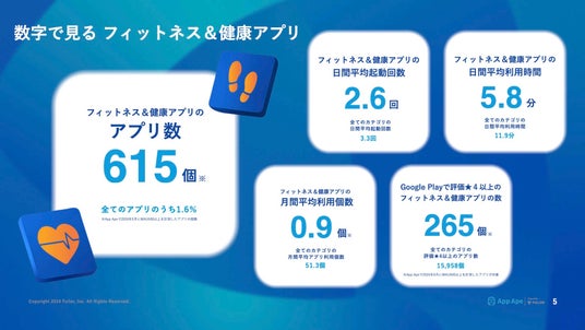フィットネス&健康アプリのアプリ数、起動回数、利用時間などの基本データを網羅しました。