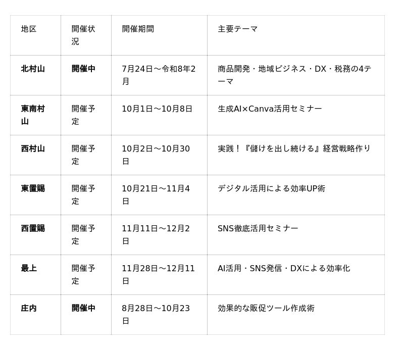 山形県商工会連合会(所在地:山形市城南町、会長:高橋智之)では、令和7年7月より中小企業・小規模事業者の経営力向上を目的とした「経営革新塾」を県内7地区で順次開催しており、北村山地区では7月24日より好評開催中です。今後も各地区の特色を活かしたプログラムを展開し、持続的な経営支援を行ってまいります。