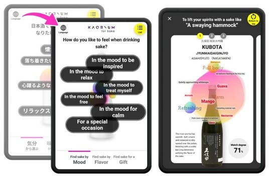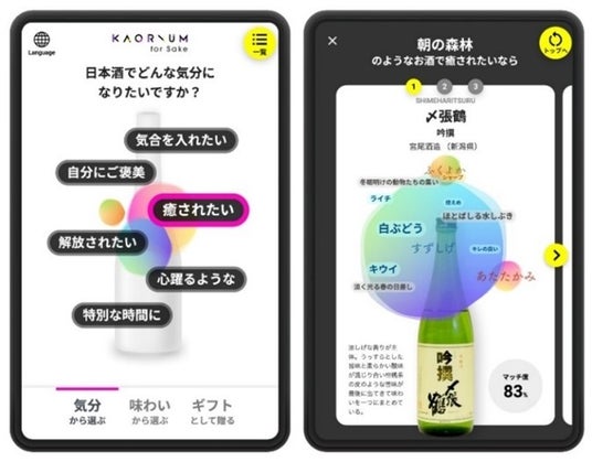 「KAORIUM for Sake」は、膨大な言語表現と人の香りの感じ方に合わせて、1万以上の日本酒の風味・感性データと酒ソムリエの感性を学習した最先端のAIシステムです。