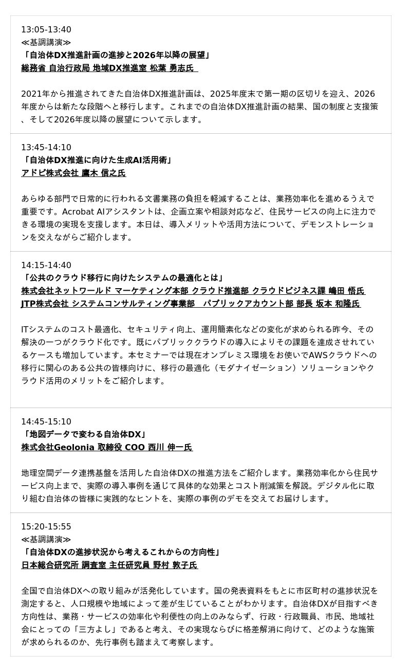 本セミナーでは、第1期自治体DX推進計画の成果と課題を振り返るとともに、2026年度以降の新たな政策動向や最新ソリューションを共有し、自治体の実務担当者が直面する課題解決のヒントを提示します。