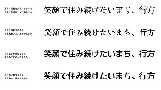 職員が「行方市らしさ」とは何かを考え、未来の行方市がどうなっていて欲しいか、行方市のいいところ、不便なところなどを述べ、それを表す書体としてふさわしいものを選出しました。