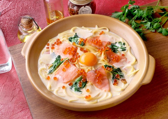 - 現在、定番メニューに加えて、期間限定の商品として、パスタは旬のきのこを使用した「きのこベーコンと5種チーズのポルチーニクリームソース」と「スモークサーモンといくらの和風カルボ」の2種、ピザは「生ハムと7種のチーズ」を販売いたします。