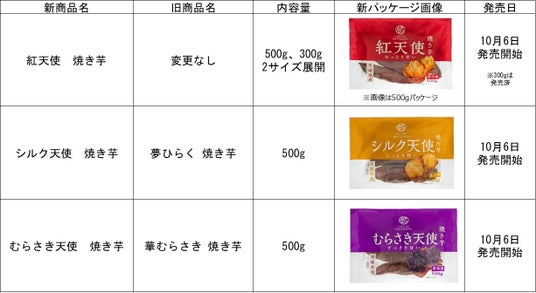 今回のブランドリニューアルにおいて、主力商品のひとつである冷凍焼き芋を新パッケージで発売開始いたします。また、昨今、冷凍焼き芋の需要が大幅に*増加している現状を踏まえて、これまで期間限定商品であったシルク天使(旧夢ひらく)とむらさき天使(旧華むらさき)を定番化、商品パッケージもシリーズブランドとして統一感を持たせています。