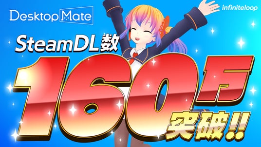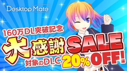 「Desktop Mate」は2025年1月8日の配信開始以降、約8ヶ月という期間で160万ダウンロードを突破いたしました。前回の150万ダウンロード達成からわずか2ヶ月での快挙となり、継続的なご支援をいただいている皆様に心より感謝申し上げます。