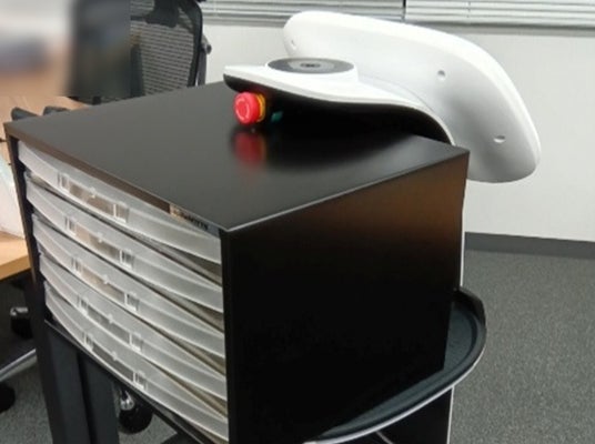 タッチパネル操作で最大3拠点まで設定し、ロボットが順次自動で書類を配送します。コピー機やプロッターのある場所でロボットを呼び出して、印刷物をデスクまで届けるといった運用も可能です。
