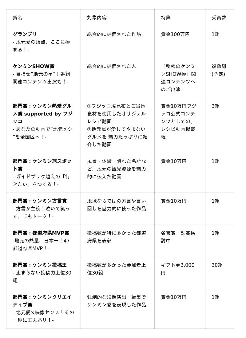 応募内容:“ケンミン愛”が溢れていること(グルメ、スポット、方言、あるある…愛の対象は全方位!)