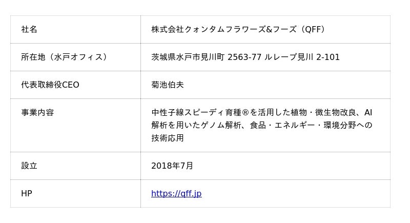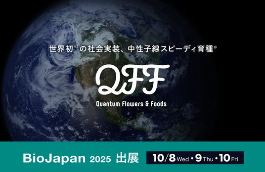 株式会社クォンタムフラワーズ&フーズ(本社:茨城県水戸市、代表取締役CEO:菊池伯夫、以下「QFF」)は、2025年10月8日(水)~10日(金)にパシフィコ横浜にて開催される BioJapan 2025 に出展いたします(小間番号:C-56)。本展示では、QFFが保有する中性子線育種技術「スピーディ育種(R)」を紹介し、バイオエネルギー分野のみならず、食品・発酵・化学・素材・環境ソリューションなど幅広い産業界への応用可能性を発信いたします。