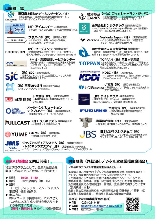首都圏などから水産業のデジタル化に関わる企業・団体が来市して出展する展示会です。入場無料ですので、どなたでもお気軽にご来場ください。