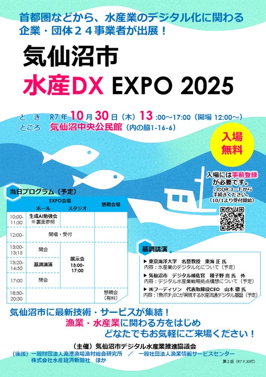この度、本協議会が主催し、「気仙沼市水産DX EXPO 2025」を実施いたします。本イベントは、市内漁業・水産業者をはじめ、広く市内外の方々に、デジタル水産業戦略拠点構想の取組内容や、漁業・水産業分野におけるデジタル技術・サービスをご紹介することを目的としたものです。