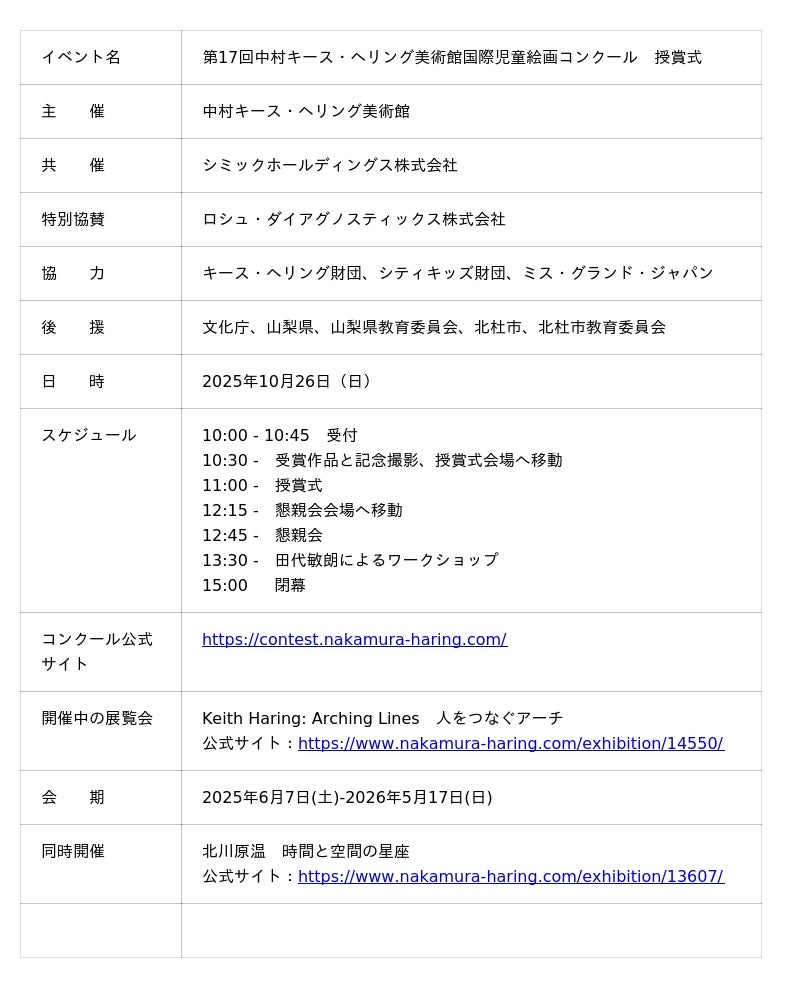 中村キース・ヘリング美術館(山梨県・小淵沢)は、「第17回中村キース・ヘリング美術館 国際児童絵画コンクール」にあたり、23の国と地域から寄せられた1,640点の応募作品の中から選ばれた11点の受賞作品を発表。同コンクールの授賞式を2025年10月26日(日)に開催します。