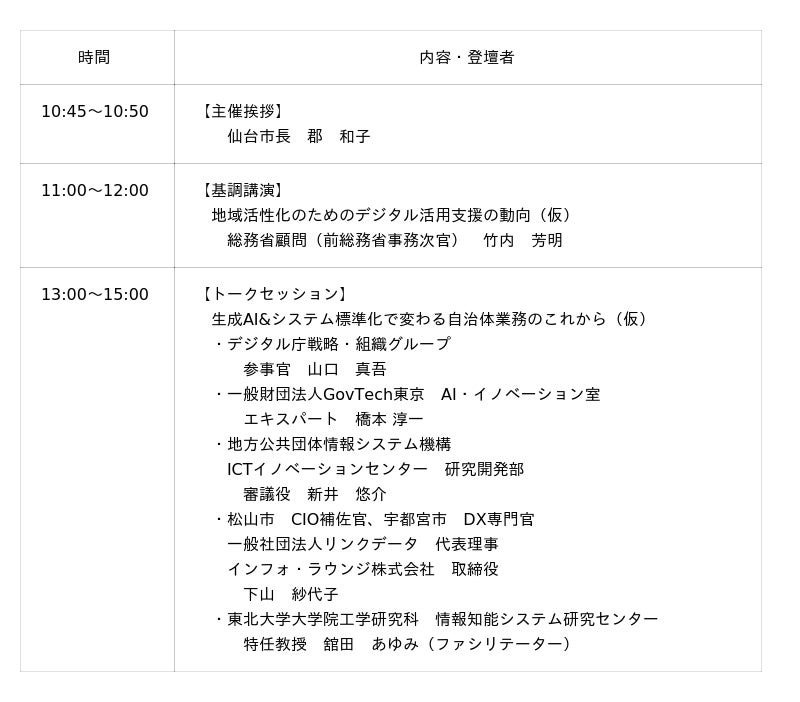 総務省で東北総合通信局長などの要職を歴任され、令和7年6月まで事務次官を務められた竹内芳明氏による基調講演のほか、行政向けに生成AIの活用に取り組むデジタル庁 戦略・組織グループ参事官の山口真吾氏、一般財団法人GovTech東京 AI・イノベーション室エキスパートの橋本淳一氏、地方公共団体情報システム機構 ICTイノベーションセンター研究開発部審議役の新井悠介氏、そして全国の自治体でDX推進やデータ利活用支援に携わる松山市CIO補佐官・宇都宮市DX専門官の下山紗代子氏をお招きし、トークセッションを開催いたします。また、出展企業・団体による展示発表を行います。