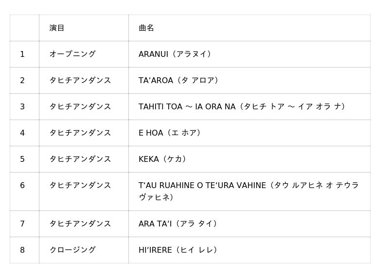 『ARANUI(アラヌイ)』はタヒチ語で「海の道」を意味し、大自然と文化をモチーフに、観る人を南太平洋の世界へと誘います。