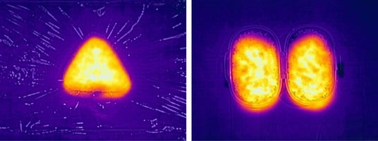 ▲冷凍おにぎりを加熱した際の温度分布を可視化したもの(左:三角形 右:おにぎりがう米わん)