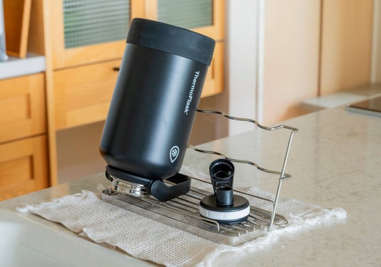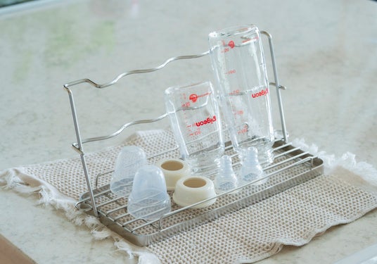 底面は高さのあるフレーム構造で、哺乳瓶の飲み口が吸水タオルに直接触れず、衛生的に乾かせます。背もたれには二段構造の波型ワイヤーを採用し、背の低い哺乳瓶も、高さのある水筒も、サイズを問わず安定して立て掛けられる設計。