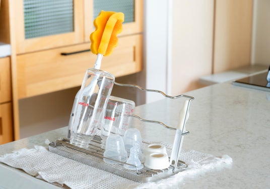 哺乳瓶用のスポンジは、普段使いのものと分けて管理することが多く、専用の置き場があることで清潔に保ちやすくなります。哺乳瓶と一緒に乾かせるため、キッチンまわりもすっきり整います。