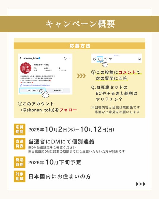 ヤシマ食品株式会社(本社:神奈川県横浜市、代表取締役:高橋勲)は、10月2日「とうふの日」を記念して「湘南豆富」のプレゼントキャンペーンを実施いたします。併せまして、神奈川県藤沢市のふるさと納税の返礼品に「湘南豆富」の商品が選定されたことをお知らせします。