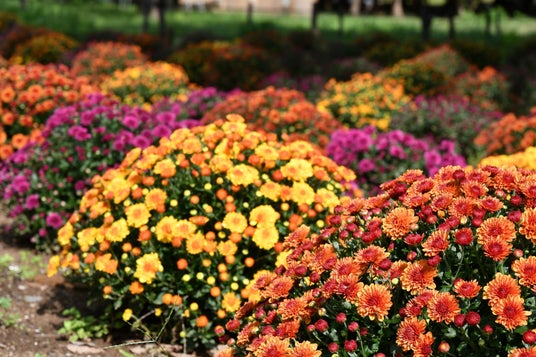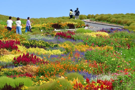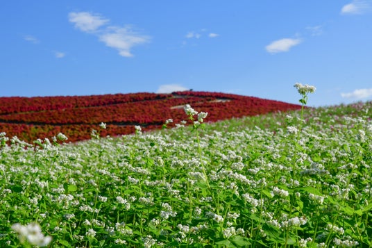 みはらしの丘は、約4万本のコキアで埋め尽くされます。10月上旬頃から徐々に紅葉が始まり、緑と赤のグラデーション、紅葉、赤と茶のグラデーションへと色合いが変化していきます。丘のふもとではコスモスやソバが咲き誇り、裏側ではススキとオギの群生が美しい秋の風景を創り出します。また、第1頂上周辺のウェルカムガーデンや、秋バラなど、多彩な秋の草花が園内を鮮やかに彩ります。