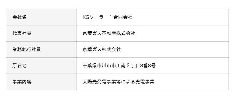 京葉ガス株式会社(代表取締役社長 江口 孝 以下「当社」)および京葉ガス不動産株式会社(代表取締役 小形 正浩 )は、カーボンニュートラルの促進のため再生可能エネルギー発電事業を担う新会社「KGソーラー1合同会社」の事業を開始いたしました。