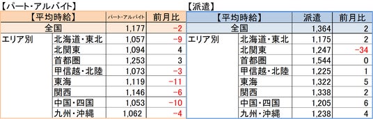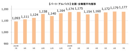 【パート・アルバイト】全国・全職種平均時給は1,177円。前月比-2円。前年同月比+84円。