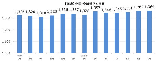 【派遣】全国・全職種平均時給は1,364円。前月比+2円。前年同月比+38円