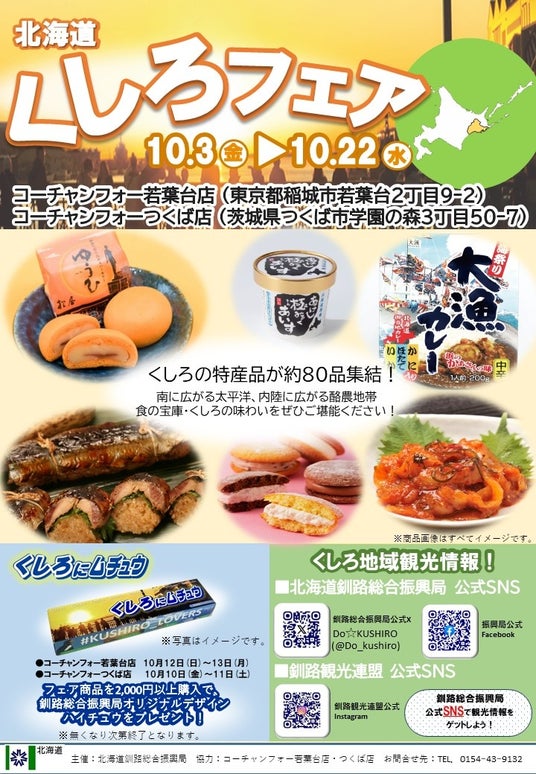 北海道釧路総合振興局では、2025年10月3日(金)から22日(水)までの20日間、北海道くしろ地域の産品を販売する「北海道くしろフェア」をコーチャンフォー若葉台店(東京都)及びコーチャンフォーつくば店(茨城県)にて開催します!