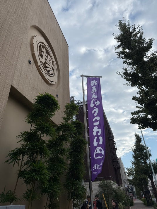 店の外にはこの日に旗揚げされた「おまんじゅうこわい」ロゴを使用したのぼりも設置され、訪れたファンを出迎えていた。