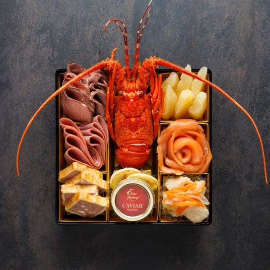 冷製イセエビ、オセトラキャビア、ミニブリニ、ローストビーフ、ボロニアソーセージ、ミートローフのパイ包み、数の子白醤油漬け、スモークサーモン、甘鯛のエスカベッシュ