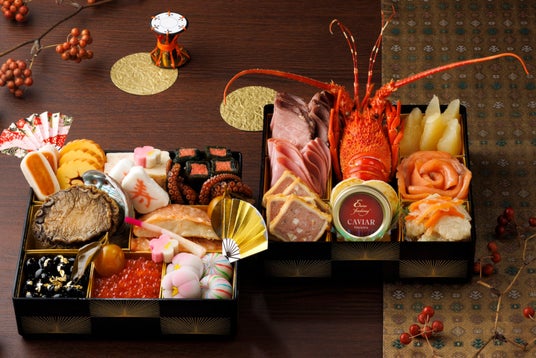 『和洋おせち 弐段祝い重』壱の重・西洋料理では、ロシアチョウザメのキャビアがお正月の食卓に華を添えます。「世界で最も美しい水」とも称される中国浙江省杭州市の千島湖(せんとうこ)で養殖された上質なキャビアは、粒の大きさは3mmほど、クリーミーな味わいが楽しめます。その他、弐の重・日本料理にはアワビやたこ・金目鯛といった、おせち料理には欠かせない日本料理の縁起物が揃います。