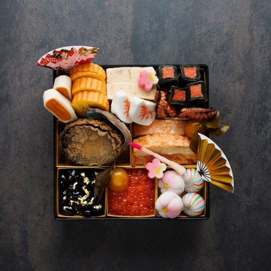 アワビ姿煮、本柚子伊達巻、からすみ風巻、寿蒲鉾、海老チーズ寄せ、鮭昆布巻、たこ照焼き、金目鯛西京味噌焼き、イクラ醤油漬け、金柑甘露煮、黒豆金箔飾り、紅白はじかみ、手まり餅、華梅、花麩