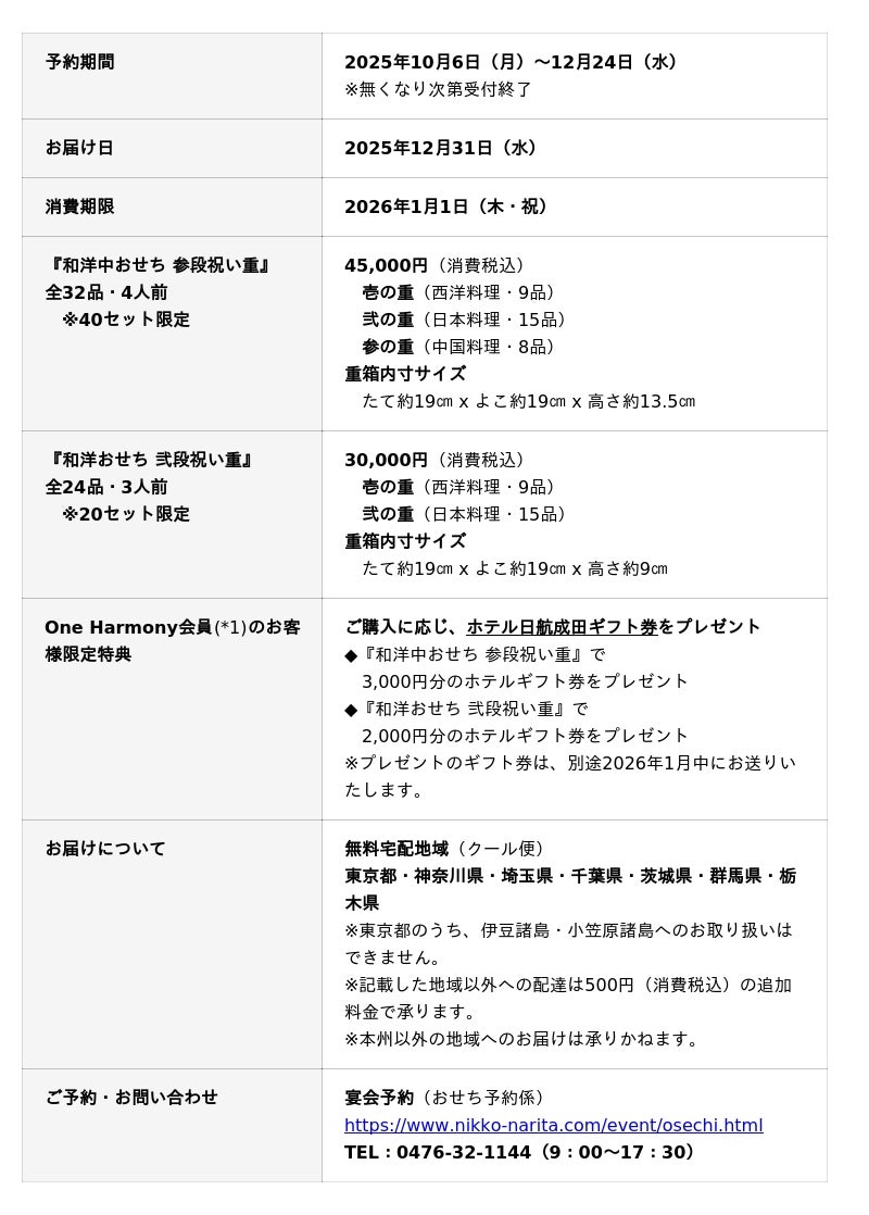 ホテル日航成田(所在地:千葉県成田市、総支配人 山田 篤)では、新年の慶びに華を添えるホテル謹製「おせち料理2026」の予約受付を2025年10月6日(月)より開始いたします。2種類からお選びいただけ、『和洋中おせち 参段祝い重』は40セット、『和洋おせち 弐段祝い重』は20セットと、いずれも限定数での販売です。