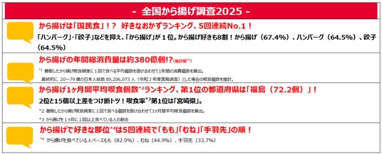 株式会社ニチレイフーズ(代表取締役社長:竹永雅彦)は、「から揚げ強化月間」に合わせて、全国の一般生活者14,099名を対象に、「鶏のから揚げ」(以下、「から揚げ」と表記)に関する意識・実態調査『全国から揚げ調査2025』を実施いたしました。
