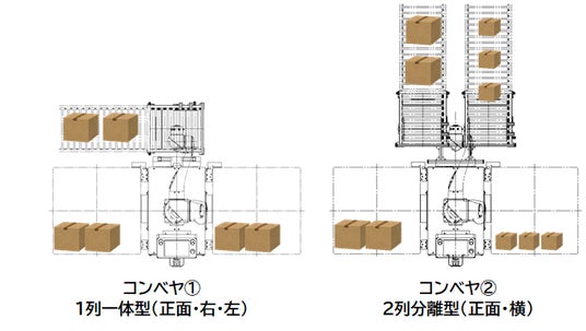 上流の搬送コンベヤの仕様やライン構成に応じて、2つのタイプから選択いただけます。1台のCoboPalで2ラインを同時に自動化することにより、省人化と生産効率が大幅に向上します。