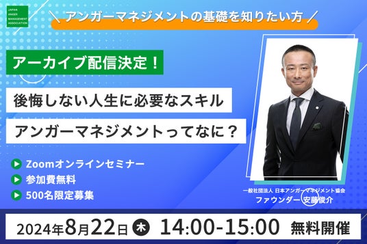 株式会社レビックグローバル(本社:東京都港区、代表取締役社長:柏木 理)が運営する一般社団法人日本アンガーマネジメント協会(所在地:東京都港区)は、昨年9月に開催した「アンガーマネジメントの基礎を知りたい方必見!後悔しない人生に必要なスキル、アンガーマネジメントってなに?」セミナーのアーカイブ動画を配信いたします。
