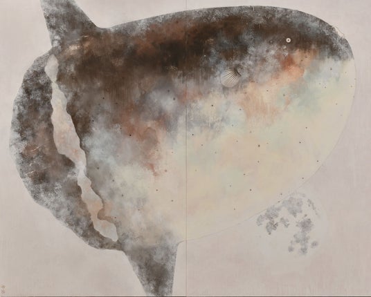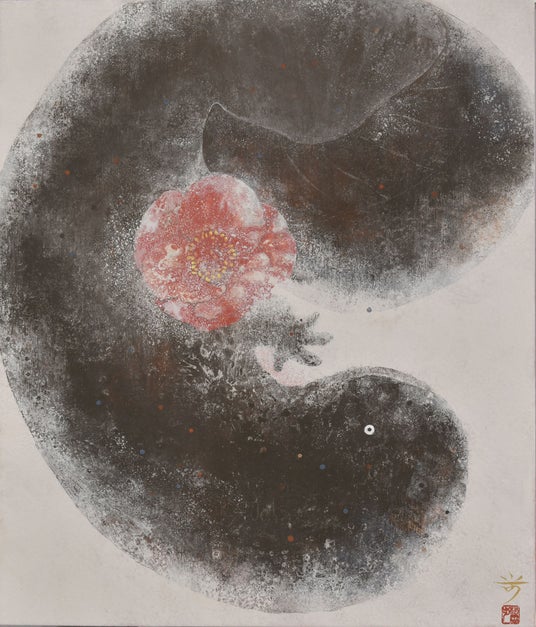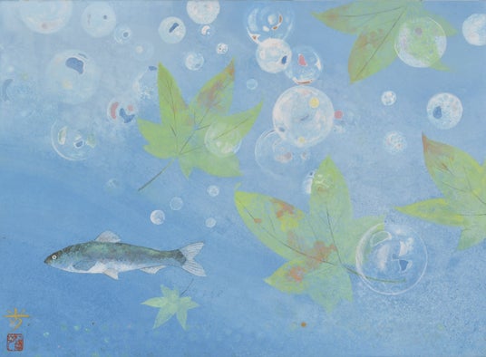 作家活動の最初期には、写実的な人物表現や神秘的な風景を描いていましたが、程なくしてオオサンショウウオをモチーフとして描く機会から、現在は両生類や動物、海の生き物が穏やかな色彩の中にそっと佇む姿を描き出しています。描かれた生き物たちが愛らしさとともに存在感をまとい、その静謐な画面の中で作家のさまざまな「想い」が作品に込められ、雄弁に語りかけてきます。また、近年はカウンターバーのモダンな景観の中、カクテルグラスで画面を大胆に分割した作品も描いています。岩絵具や金砂子で、グラスに注がれたアルコールの鮮やかな色や香気を巧みに表現されています。