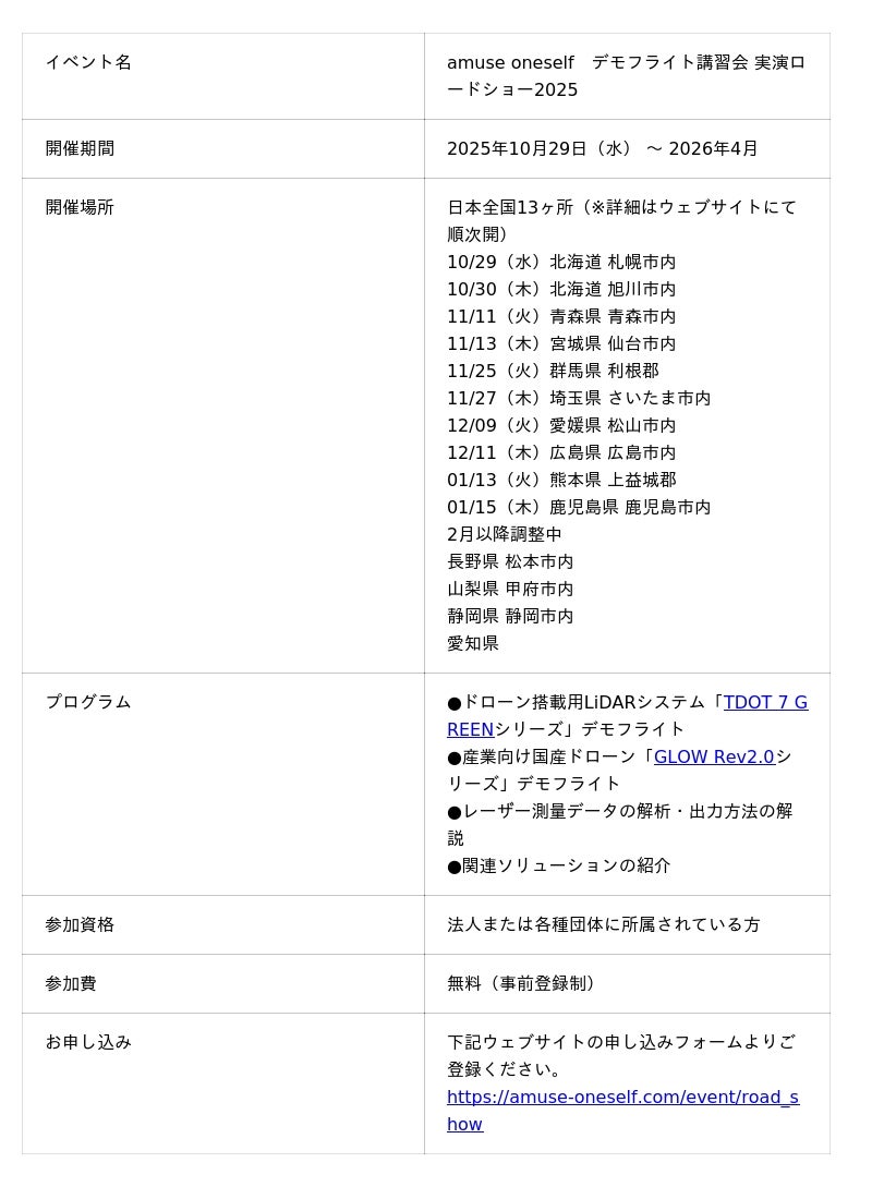株式会社amuse oneself(本社:大阪市北区/代表取締役:冨井 隆春 以下「アミューズワンセルフ」)は、2025年10月29日から2026年4月にかけて、日本全国13ヶ所にて「デモフライト講習会&実演ロードショー2025」を開催します。