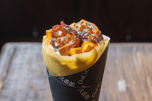 【やきいも処DOCO弐番館】の “パリトロ・ロイヤルクレープ”カリカリに素揚げした紅あずまに、燻製醤油を使った大学芋のタレとのり塩フレーバーで仕上げた贅沢なクレープ!