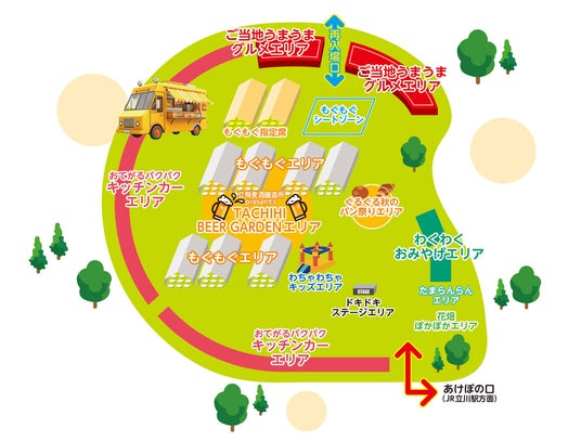 さらに、会場のある立川・多摩エリアの魅力をPR する「たまらんらんエリア」や「ドキドキステージエリア」「わちゃわちゃキッズエリア」「花緑ぽかぽかエリア」など、グルメ以外にもご家族で楽しんでいただけるエンターテインメントエリアを設けております。