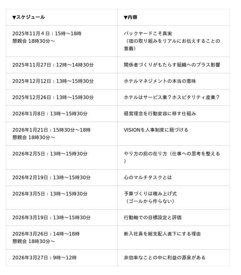 株式会社ダイブ(東京都新宿区 代表取締役社長:庄子潔、証券コード151A)の子会社である株式会社宿屋塾(東京都新宿区 代表取締役社長:山本拓嗣)は、2025年11月よりホテル経営塾「佐野ゼミ~与え合う企業風土づくりから始まるホテル経営~」を初開講いたします。