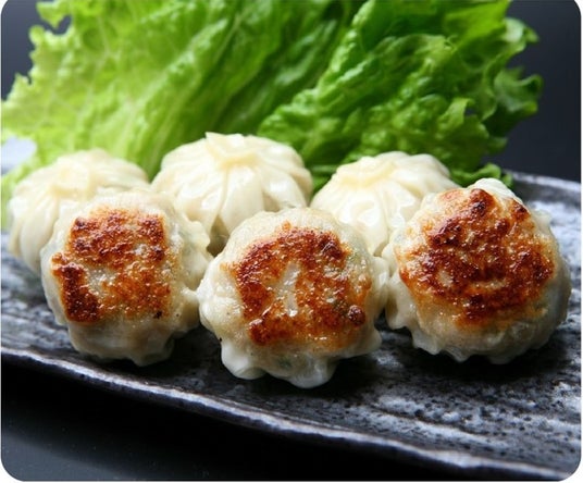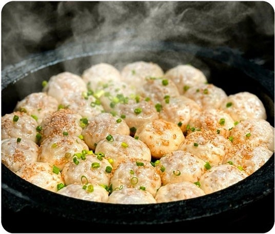 右)普通よりも厚めの皮がもっちりとした食感を生み出し、底面のカリッとした食感とのコントラストを際立たせます。ひと口食べると旨みが凝縮された肉汁のスープがあふれ出し、口の中が幸せに。熟練スタッフが一つひとつ手包みする技と、丁寧に作り上げる想いが何よりおいしさの秘訣です。