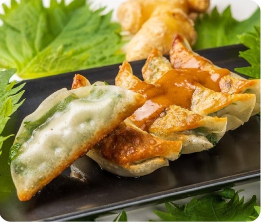 右)和風だしが効いたあっさりとした餡に、地元で採れた青紫蘇を贅沢にまるっと巻いた“しそ餃子”。透けて見える青紫蘇が食欲をそそり、ひと口食べれば、青紫蘇の風味も香りもふわりと広がります。さっぱりとした味わいに、濃厚な自家製味噌だれが絶妙なおいしさです。