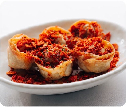 右)ぷりっぷりの海老の食感と旨みが詰まった海老餃子をカリッと揚げ、チリソースと旨辛スパイスを絡めた人気のひと品。フライドオニオン、ガーリック、クミン、唐辛子などを合わせて7種類のスパイスをブレンドした“毛沢東スパイス”が食欲をそそります。