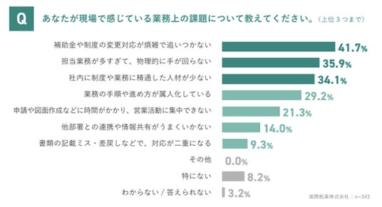 A.現場で感じている業務上の課題として、営業担当者の41.7%が「補助金や制度の変更対応が煩雑で追いつかない」と回答しています。