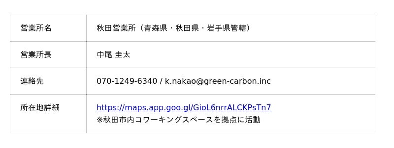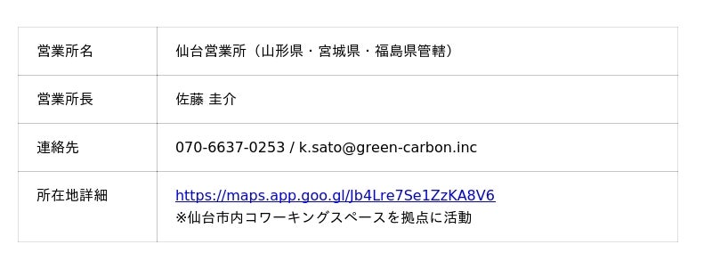 Green Carbon株式会社(東京都港区、代表取締役:大北 潤、以下Green Carbon(読み:グリーンカーボン)はこの度、自然由来のJ-クレジット創出に向けて秋田営業所と仙台営業所を新設したことをお知らせします。今回の営業所新設を機に、東北エリアでの農業生産者、森林所有者、酪農家、パートナー企業を募集し、2026年までに東北地方の水田面積約349,000haの5%相当にあたる約20,000ha、東北地方の乳用牛約89,300頭の約6%相当にあたる酪農5,000頭への拡大を目指します。