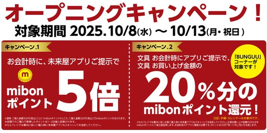 期間中、「BUNGUU」取り扱いの文具をご購入時に未来屋書店公式アプリをご提示(セルフレジではスキャン)いただくと、ご購入金額の20%分をmibonポイントで還元いたします。ポイントは後日付与されます。