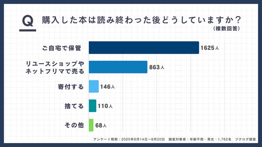 アンケートの回答対象となった「ブクログ」のユーザーは、回答者の93%以上が月に1冊以上本を読み、そのうち約23%が月に10冊以上本を読む、読書を習慣としている方々です。調査結果から、約92%の方が購入し読み終えた本を自宅保管していることが明らかとなりました。また、「リユースショップやネットフリマで売る」が約49%、「寄付する」が約8%と、手放す際も、大切に読んだ本を捨てずに再利用に繋がる方法を選択したいことが考えられます。