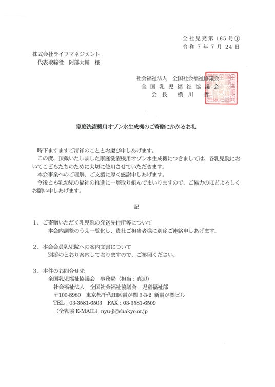 家庭洗濯機用オゾン水生成器シリーズ(累計1万台)を販売する(株)ライフマネジメントは、全国乳児福祉協議会ご協力のもと、全国の乳児院17か所に58台の「New ELEZONE」を寄贈しました。