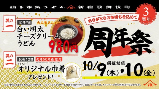 期間中に「山下本気うどん 新宿歌舞伎町」にご来店いただいたお客様を対象に、10月9日(木)は白い明太チーズクリームうどんを980円(税込)で提供し、10月10日(金)は先着50名様限定で、山下本気うどんオリジナル巾着をプレゼントいたします※2。
