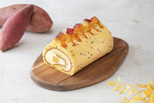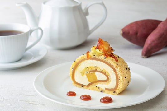 みたらし風味の羊羹を包み込んだ、大学いもを感じられるような秋のロールケーキです。