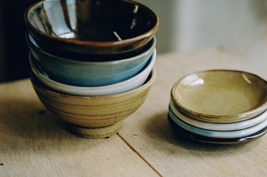 茨城県笠間市の地域産業との取り組みで誕生した笠間焼のシリーズ。窯元「向山窯(こうざんがま)」とのコラボレーションで生まれたオリジナル商品で、5色の釉薬を使った茶碗と小皿、全10種をご用意しています。土づくりから成形、乾燥、素焼き、施釉(釉薬を塗布すること)、本焼きまで、ひとつひとつ手作業で丁寧に製作されています。(一部店舗での販売)