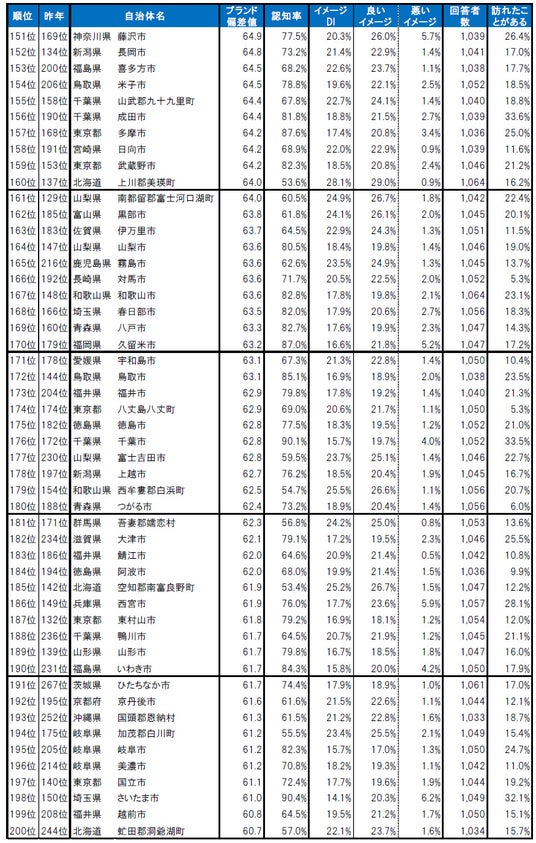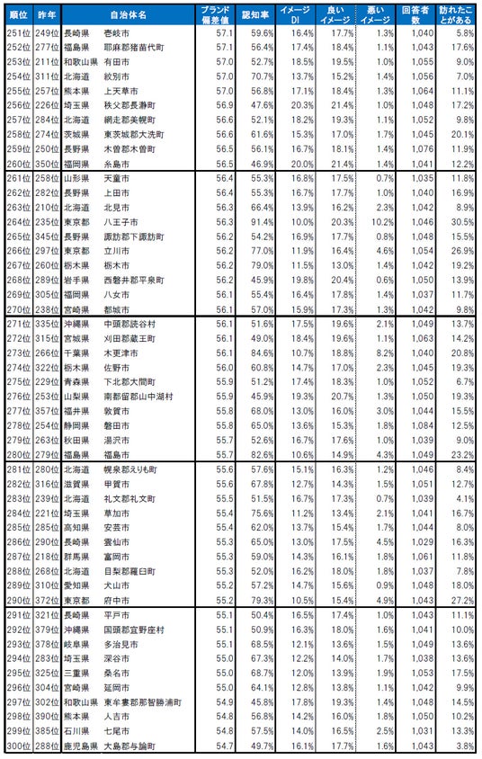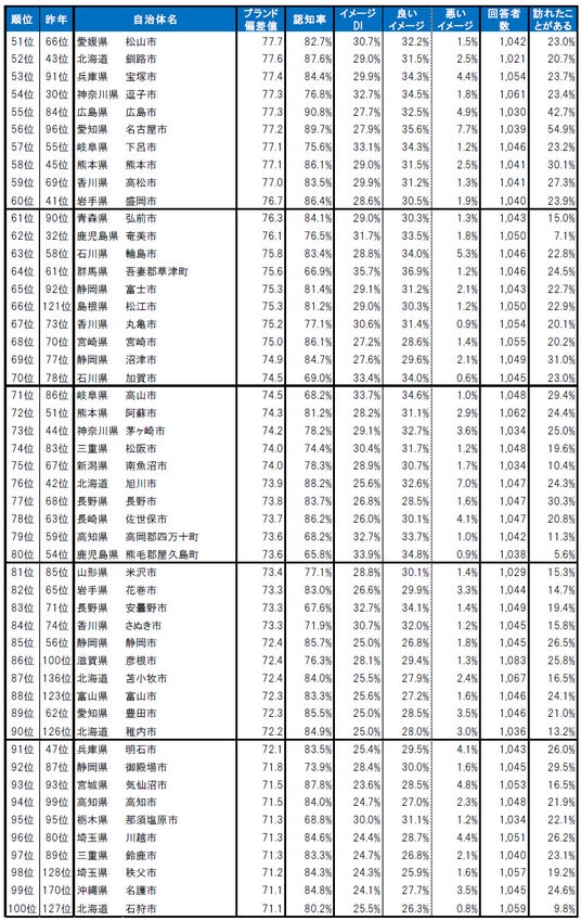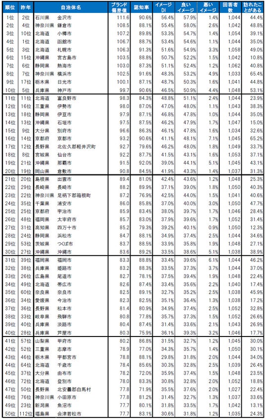 1位は石川県金沢市、2位は神奈川県鎌倉市、3位は北海道小樽市、4位は北海道函館市、5位は北海道札幌市など、観光地として有名な自治体が今年も上位にランクインしており、そのうち3つは北海道の自治体となっています。トップ10内では、6位沖縄県宮古島市(昨年15位)、9位栃木県日光市(昨年17位)が、昨年より順位を上げてトップ10入りしています。トップ10の自治体に対する認知率は90%前後と非常に高く、イメージDIは40~50%と非常に高くなっています。一方で、100位以下の自治体でも認知率が90%近くある自治体もありますが、イメージDIが30%台を超える自治体はありません。また、ランキングとして公表はしていませんが 、イメージDIがマイナスの自治体もごく少数ですが存在します。